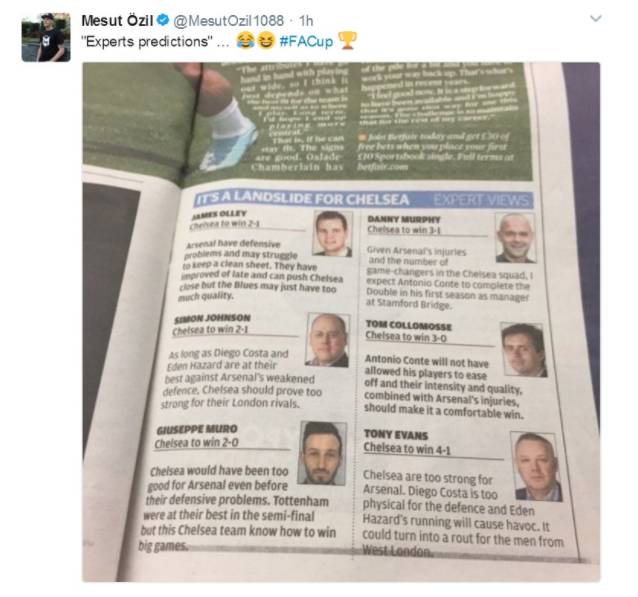 16/17赛季足总杯决赛的赛前,一家英媒的6位专家不约而同地预测切尔西会取胜夺冠,他们预测的结果分别是:2-1、3-1、2-1、3-0、2-0和4-1。