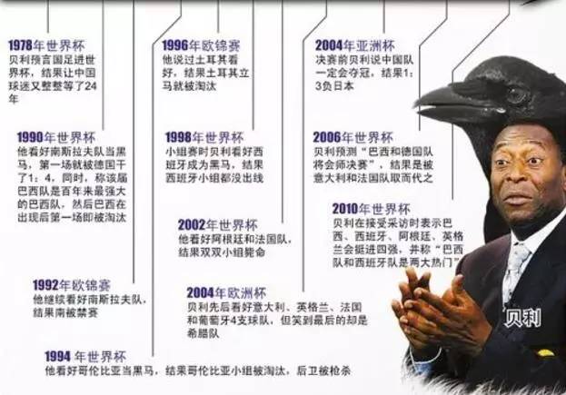 如果说汉森和谢晖是一时笑柄,那么球王贝利则是用自己的生命来告诉大家,我是“乌鸦嘴”。贝利1977年首次访问中国时曾表示:“中国队很快就能进入世界杯。”这句话之后,中国队苦苦挣扎了20年,才在2002年勉强挤入世界杯。接着,1991年女足世界杯上,贝利进一步表扬中国男足,认为中国男足十年内能迈入世界一流行列,结果,中国男足根本不入流。据统计,从1990年世界杯开始,每届世界杯贝利都会作出预测。被他看好的球队无一例外地提前被淘汰掉了。