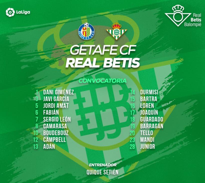 【西甲大名单】皇家贝蒂斯公布大名单:萨纳夫里亚依旧缺席