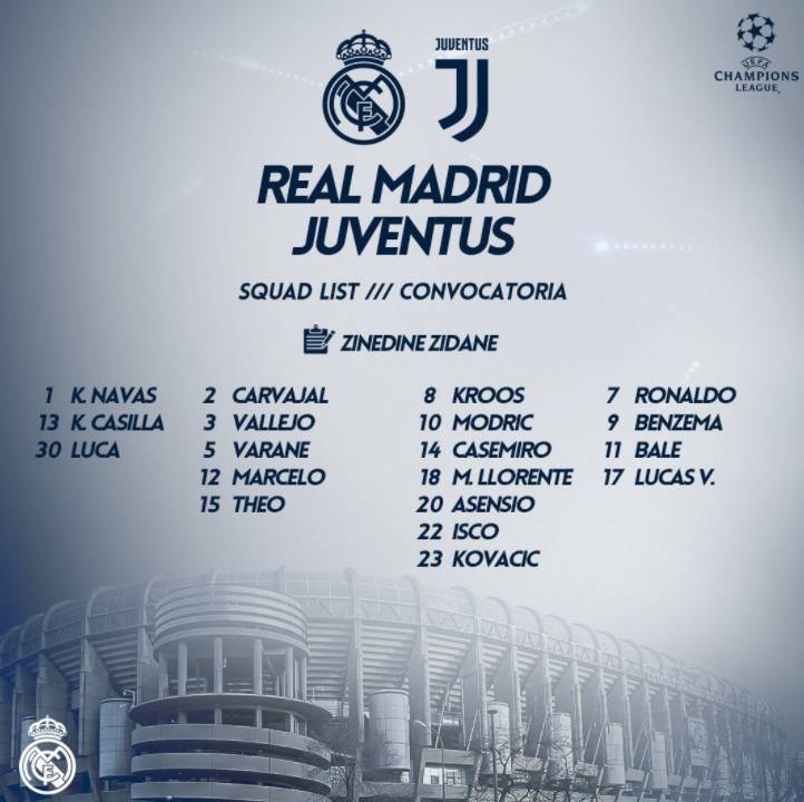 皇马战尤文大名单:BBC领衔,拉莫斯停赛
