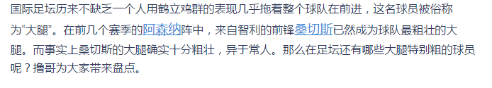 国际足坛历来不缺乏一个人用鹤立鸡**的表现几乎拖着整个球队在前进,这名球员被俗称为“大腿”。在前几个赛季的阿森纳阵中,来自智利的前锋桑切斯已然成为球队最粗壮的大腿。而事实上桑切斯的大腿确实十分粗壮,异于常人。那么在足坛还有哪些大腿特别粗的球员呢?