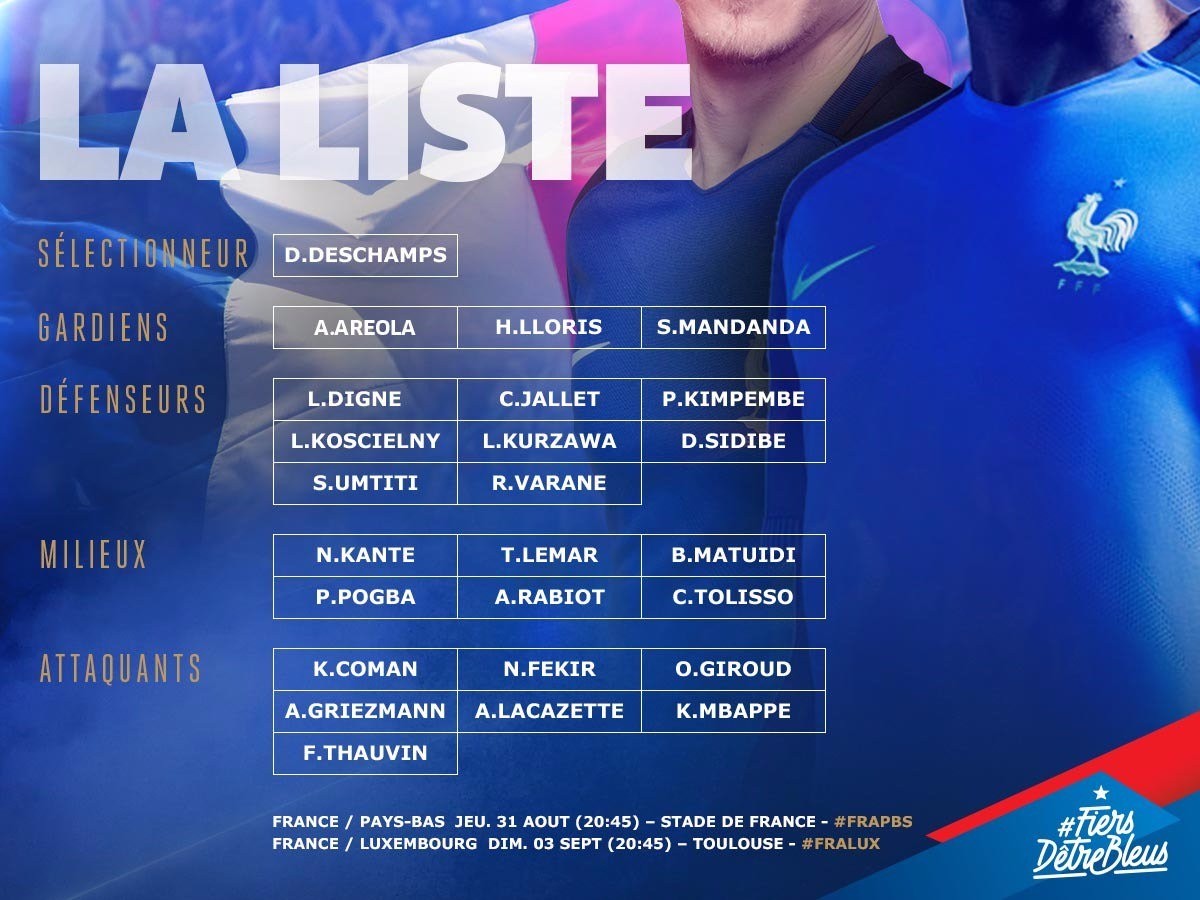 前锋:费基尔(里昂)、吉鲁(阿森纳)、格列兹曼(马竞)、拉卡泽特(阿森纳)、托万(马赛)、姆巴佩(摩纳哥)、科曼(拜仁)