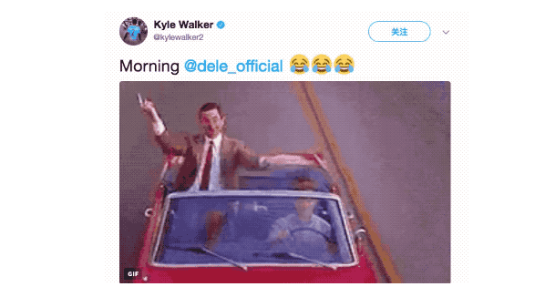 不久后,沃克在推特上上传了一张憨豆先生坐在敞篷车里意气风发地四处比着中指的动图,配文“早上好!”,还@了阿里,似乎是在力挺惹出中指风波的队友。
