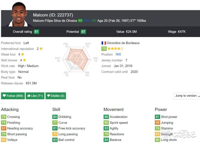 马尔孔本赛季7场联赛打入1球,不过他在边路积极的盘带和传威胁球都是球队重要一环。在FIFA18中马尔孔虽然速度不算出挑,但93的敏捷能力可以让他轻松摆脱防守的纠缠。此外射门力量和80的远射能力也能发挥他“远程轰炸”的能力。