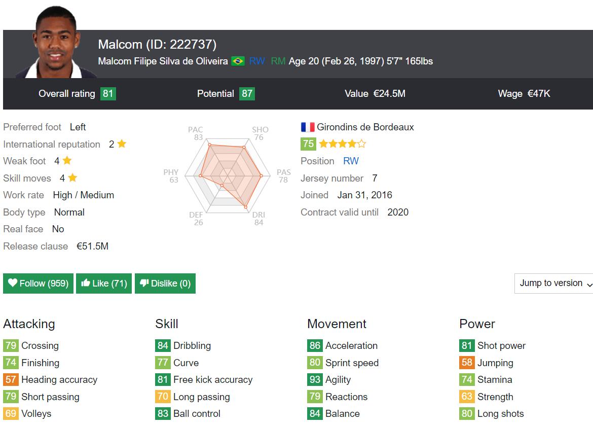 FIFA18 UT法甲开荒球员推荐:“小内马尔”马尔孔堪称右路大杀器