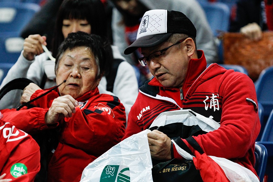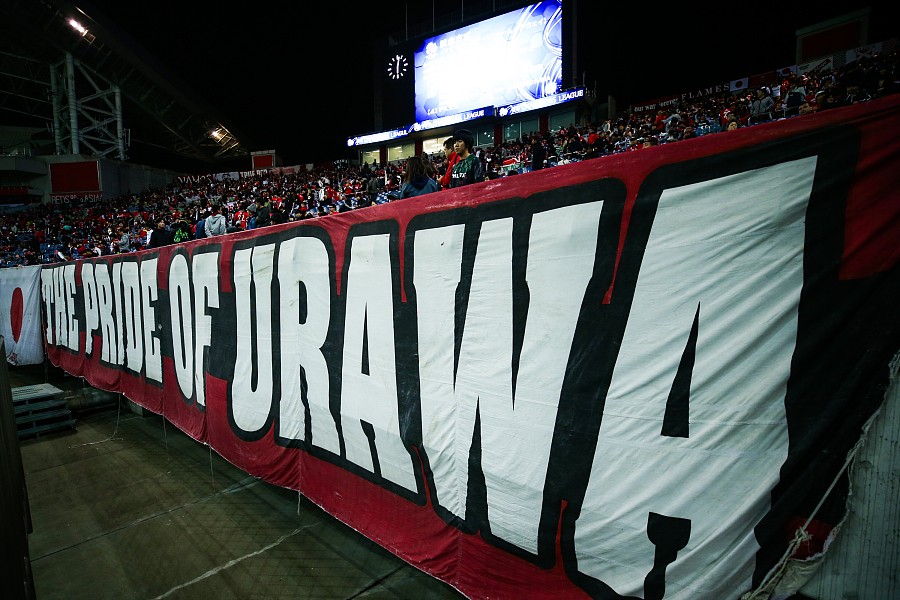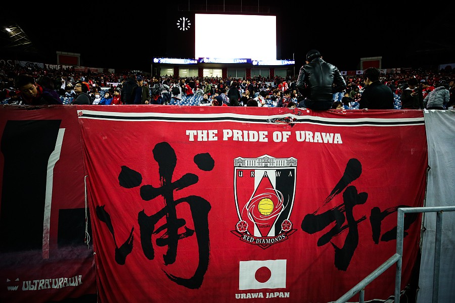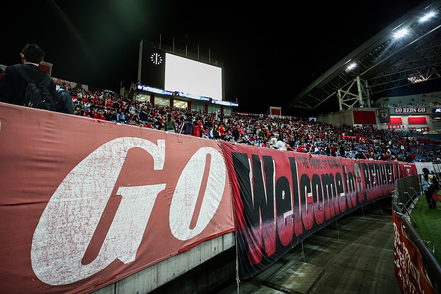 北京时间10月18日,亚冠联赛半决赛次回合浦和红钻主场迎战上海上港的比赛即将打响,浦和红钻球迷为主队加油助威。
