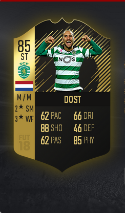 巴斯.多斯特,本周周**,是目前所有85能力值**中最便宜的一张卡,PC、PS都只要20000金,比同比分其他85能力值的**便宜了10000,并且位置是ST,以后无论是什么阵型的SBC都可以用的上。而且他是葡超,户口极好,为什么说他户口好,不仅仅是因为做传奇科斯塔,本菲卡任务可以直接用,而是因为以下这几张**的存在。
