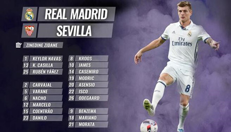 中场:克罗斯,哈梅斯·罗德里格斯,卡塞米罗,莫德里奇,阿森西奥,伊斯科,厄德高