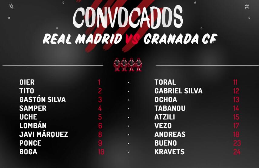 格拉纳达后卫福尔基耶尔(5场)、萨尼尔(7场)和昆卡(10场1球)均因伤休战。