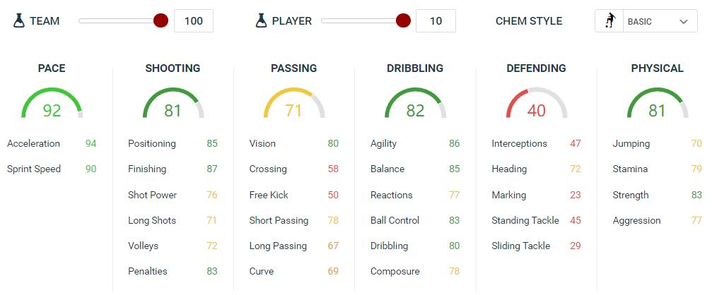 射门方面87的射术完全够用,盘带几项关键数据都在80以上。总体来说该球员没有太大短板。
