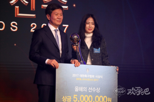 昨天下午,韩国足协2017年度颁奖礼在首尔举行。韩国女足核心李玟娥首次当选最佳女球员。
