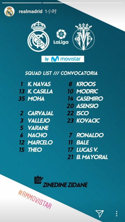 北京时间1月13日晚23:15,西甲联赛将继续进行。皇马将在主场对垒潜水艇比利亚雷亚尔,目前皇马主帅齐达内公布了本场大名单:除了本泽马和拉莫斯之外,其余主力均在阵中。