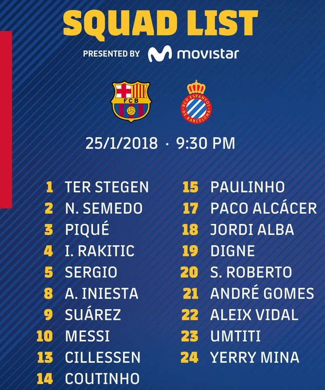 JRS直播讯,近日,巴塞罗那官方公布了球队国王杯1/4决赛次回合比赛的大名单,冬窗新援库蒂尼奥和米纳均首次入选,伊涅斯塔、帕科伤愈复出。