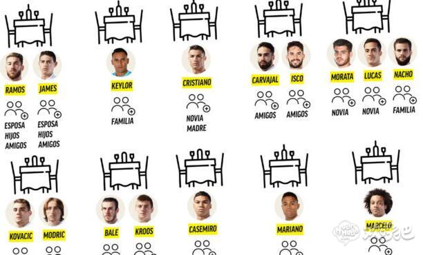 马塞洛和家人一桌;拉莫斯、哈梅斯以及他们各自的家人与朋友一桌;C罗和女友以及妈妈一桌;科瓦契奇和女友以及莫德里奇与妻子**一桌;贝尔和克罗斯及其各自家人一桌。